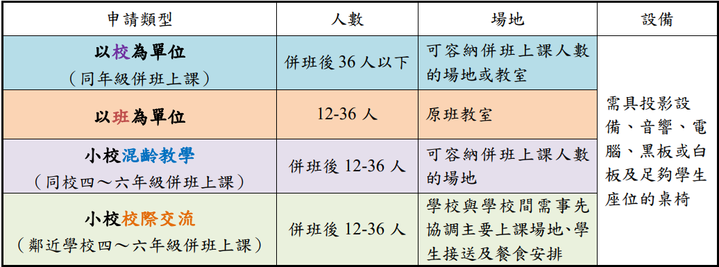五、活動地點:原學校班級或符合之活動場地,設備所需投影設備、音響、電腦、黑板或白板及足夠學生座位的桌椅