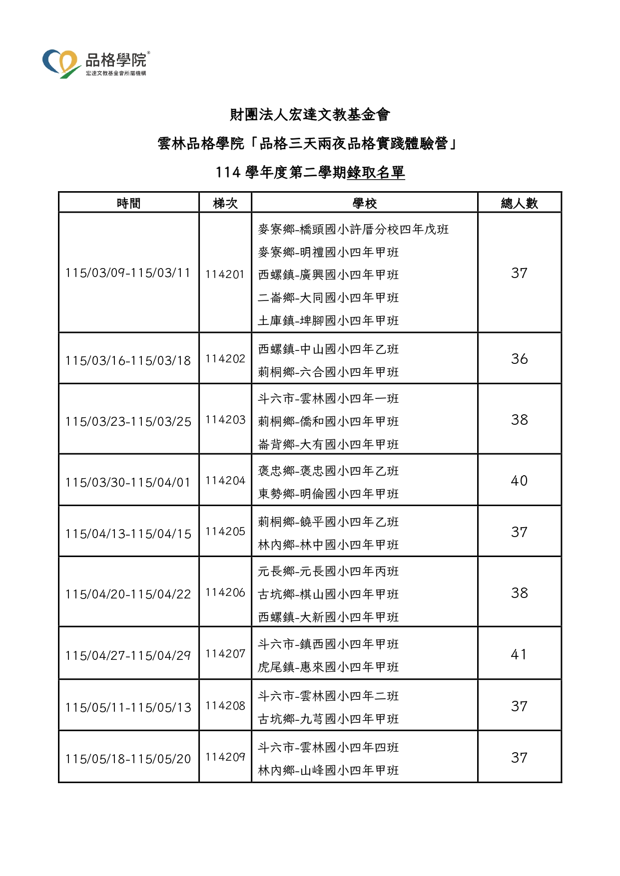 一、 雲林品格學院「品格三天兩夜體驗實踐營114學年度下學期錄取名單」詳如附件。